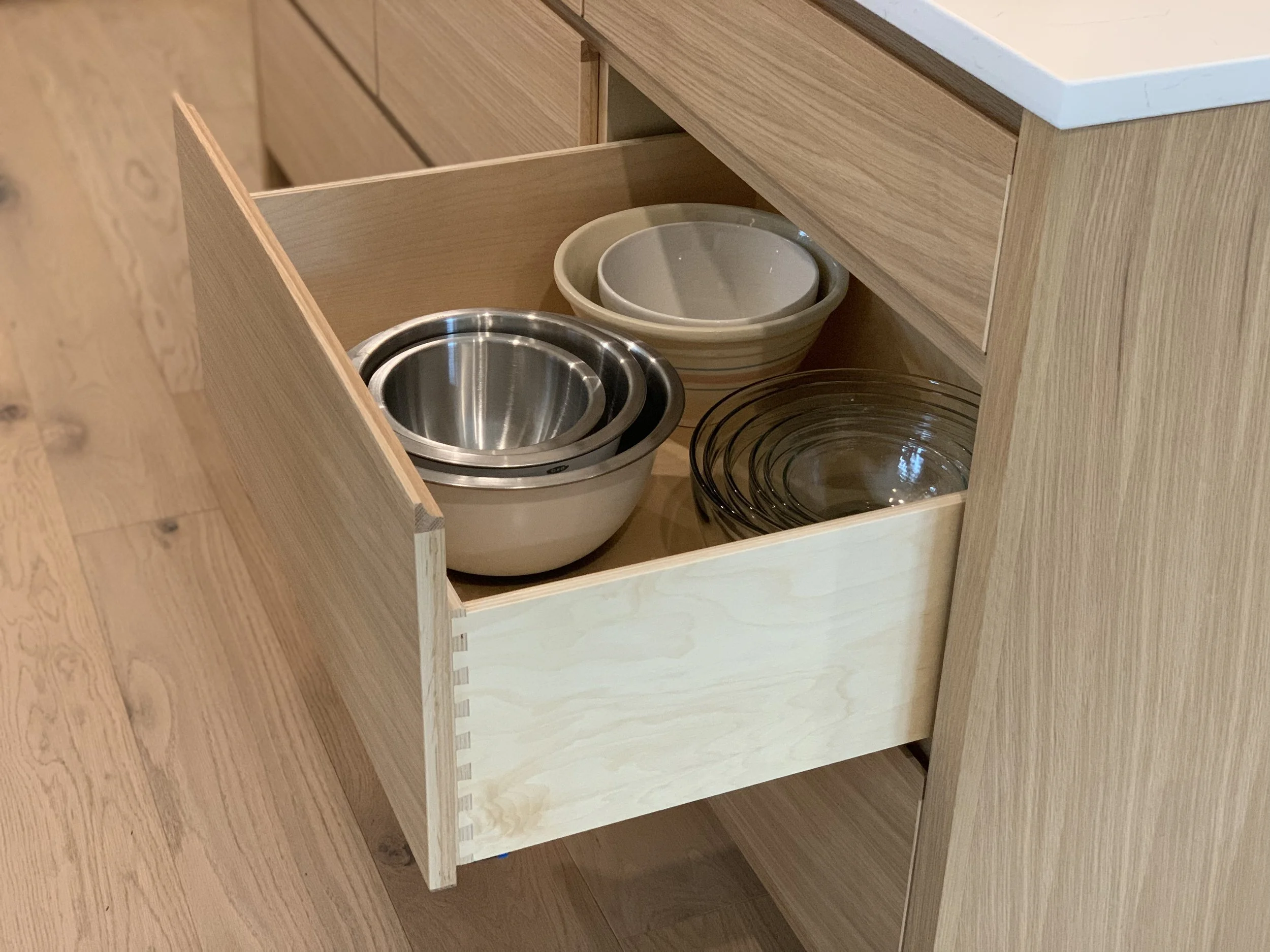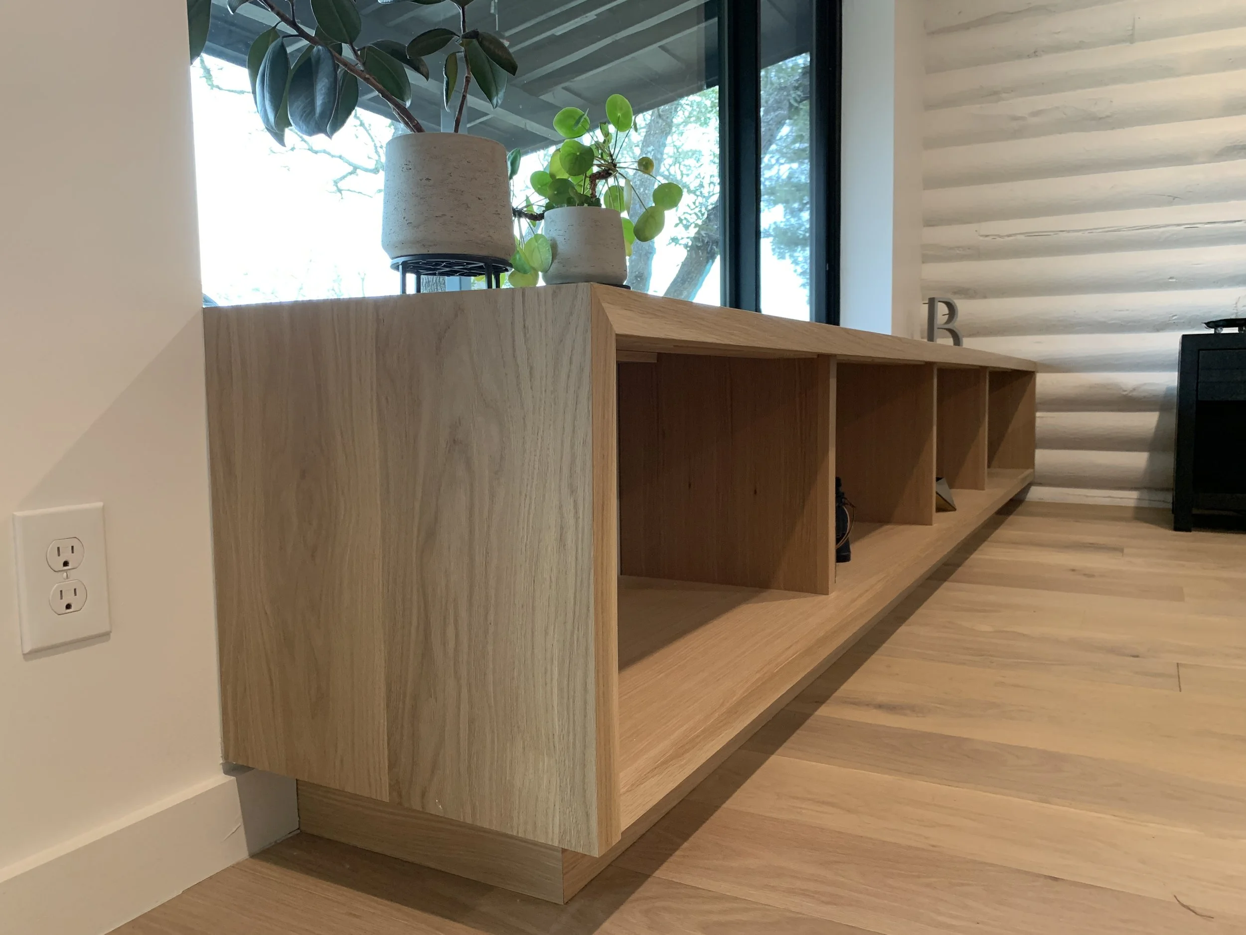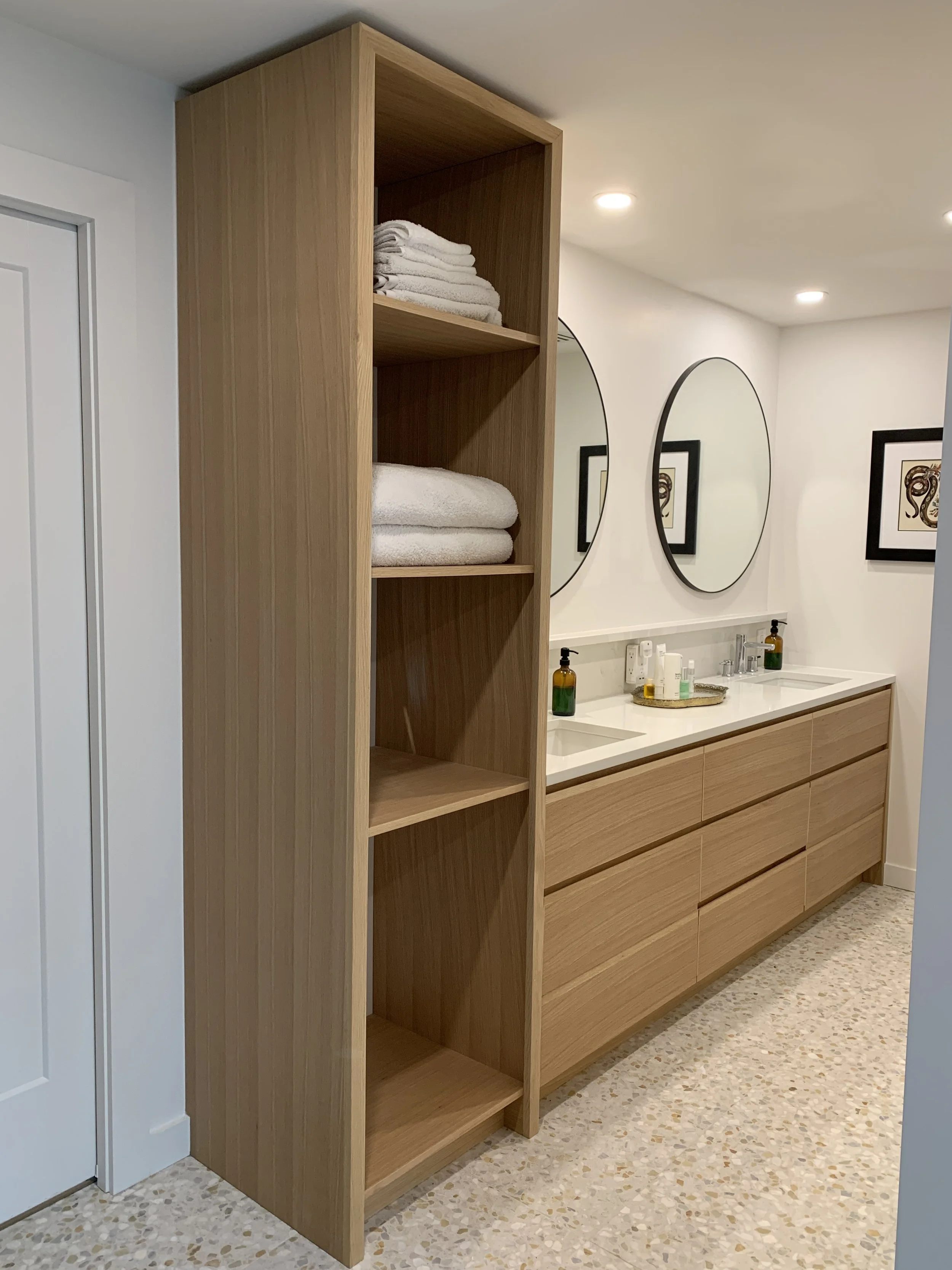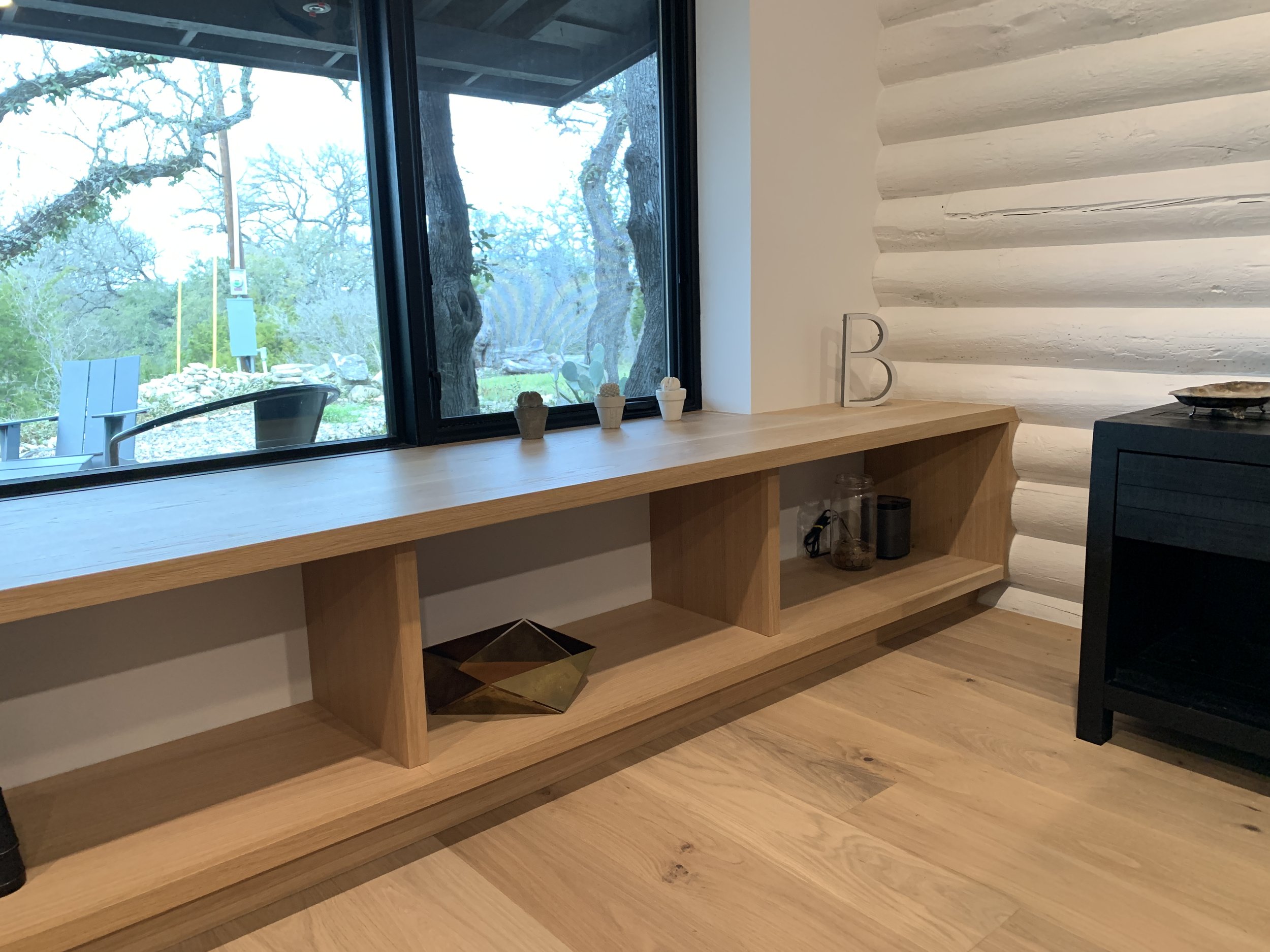 White oak and paint grade shelving and cabinets with custom milled, integrated door pulls.