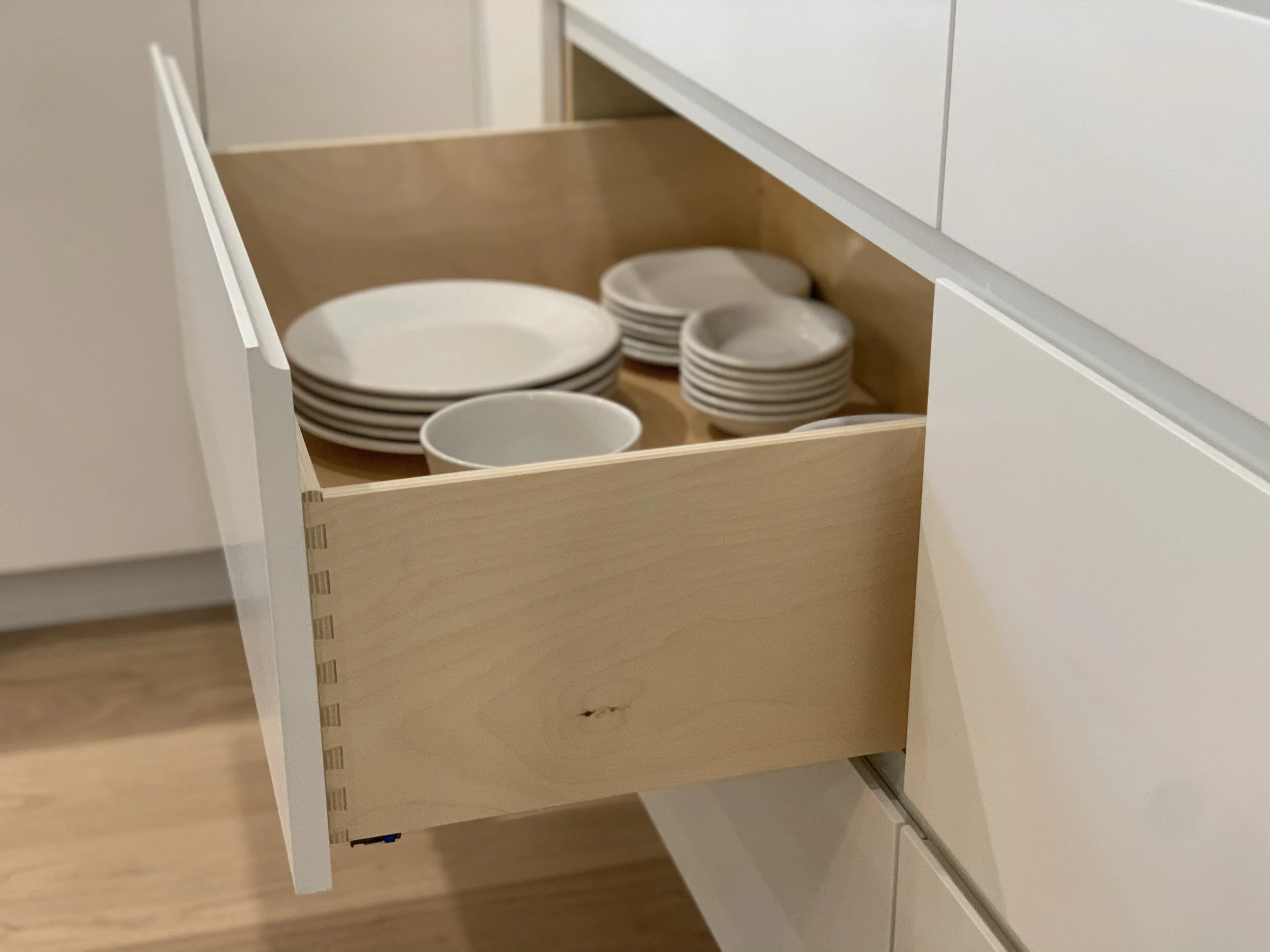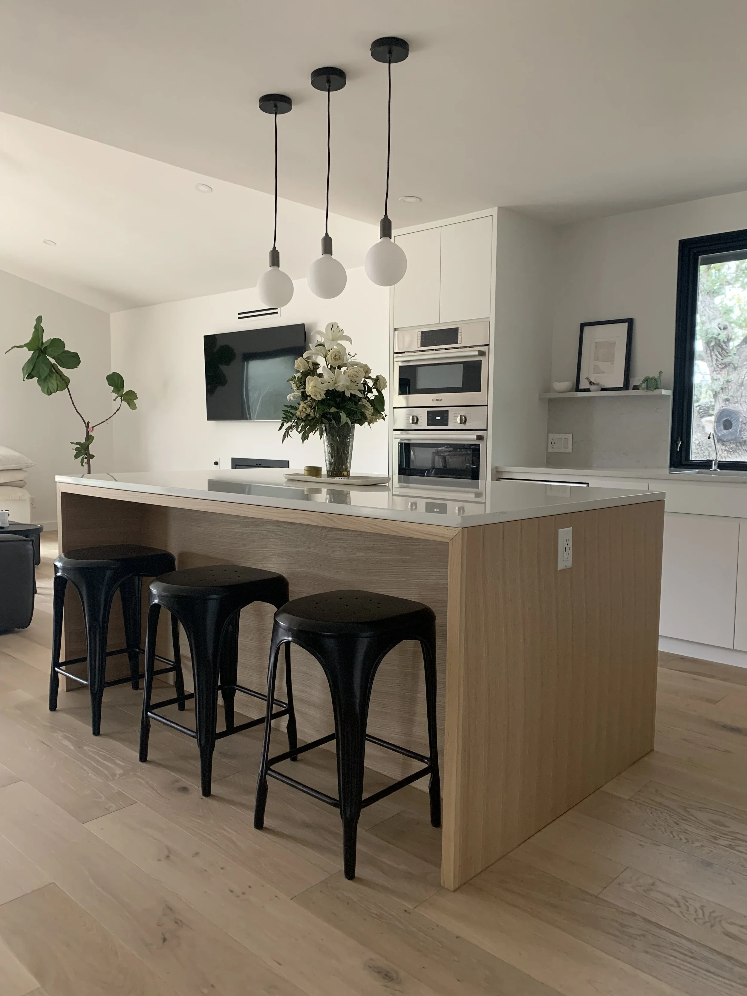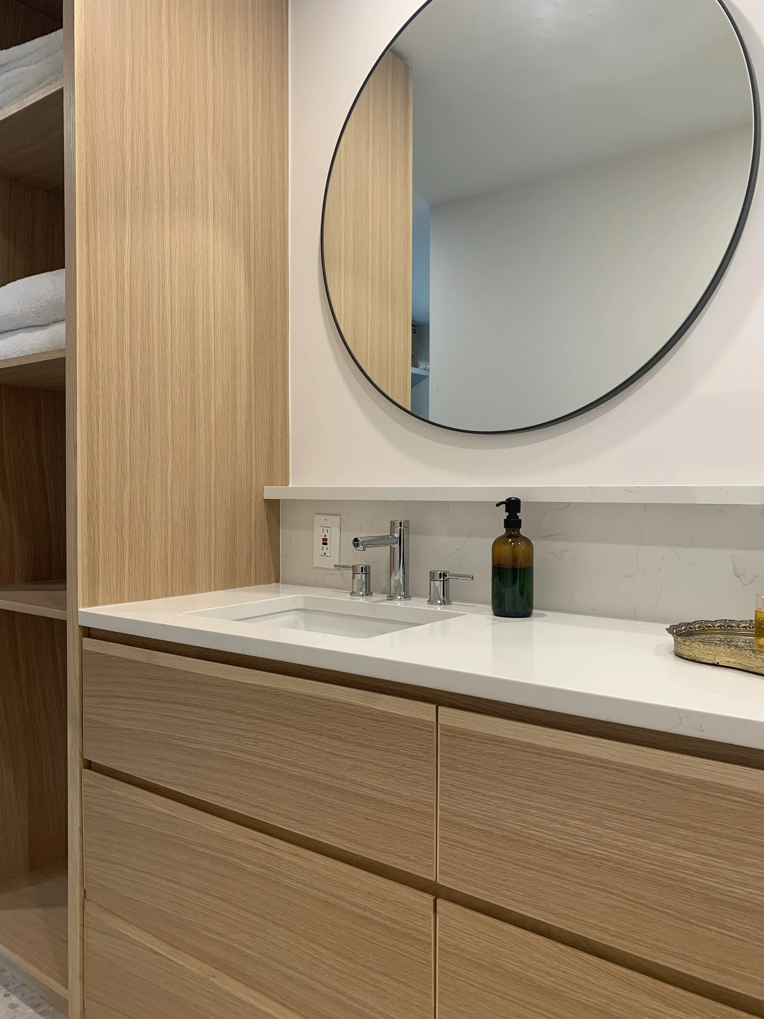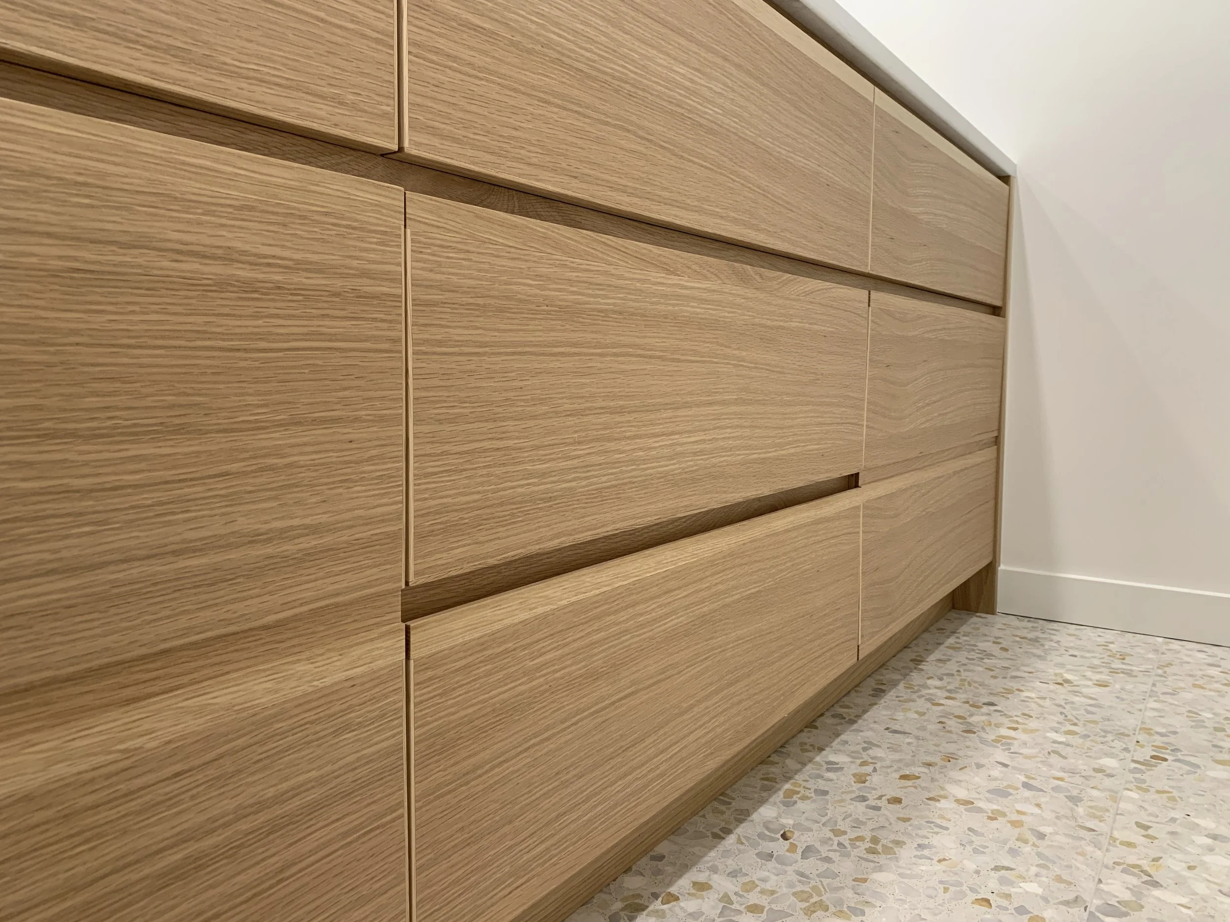 White oak and paint grade shelving and cabinets with custom milled, integrated door pulls.