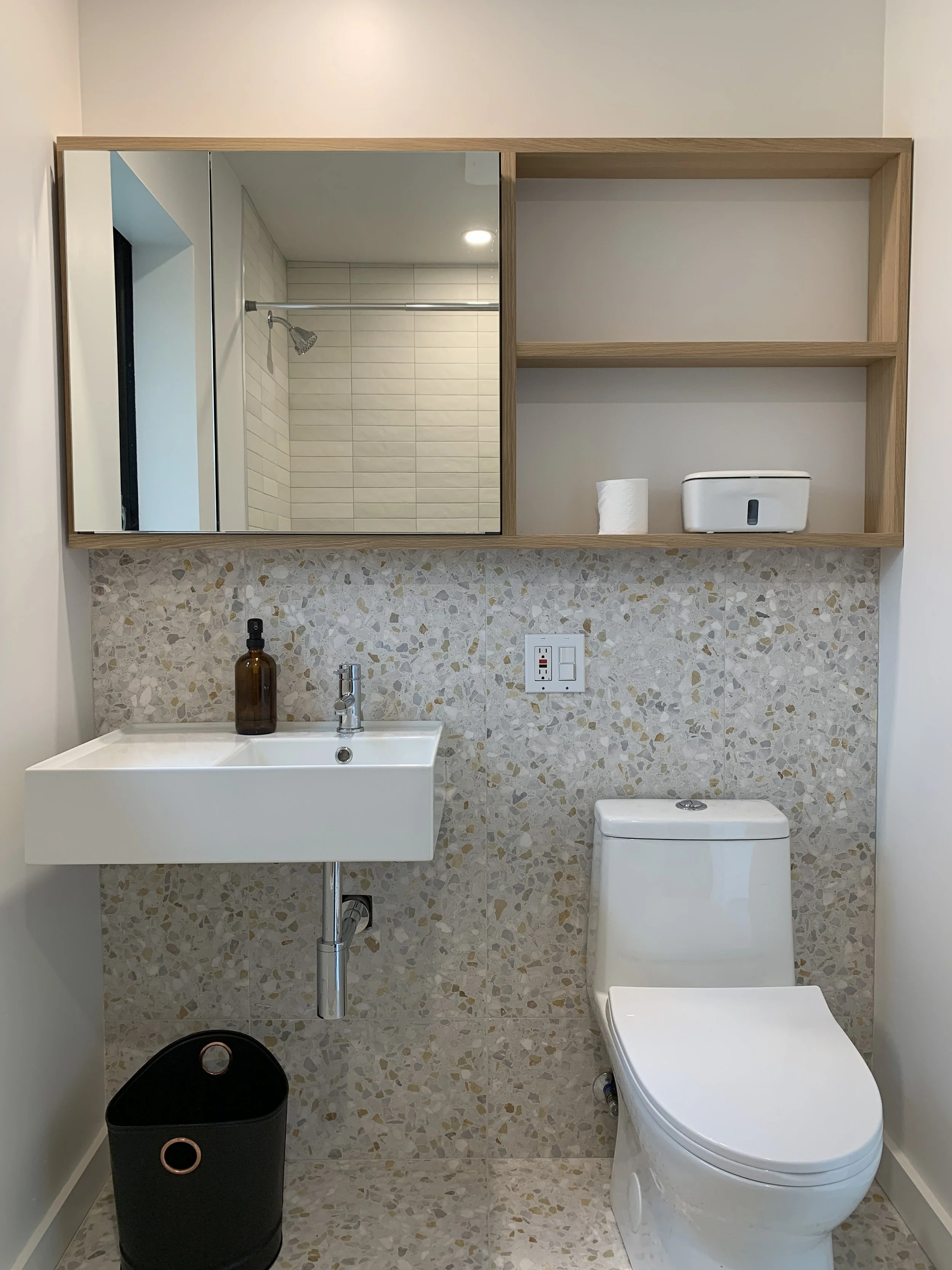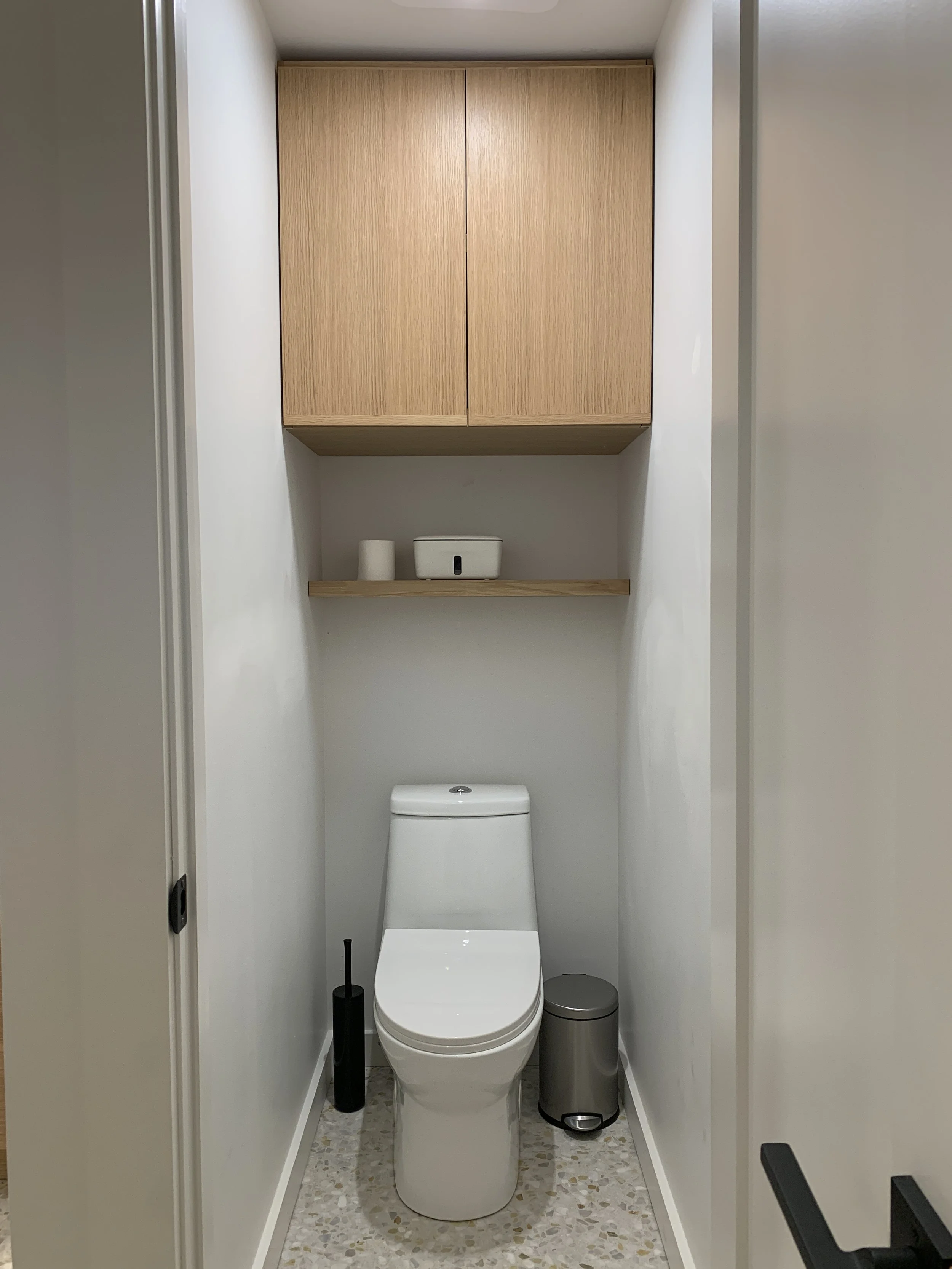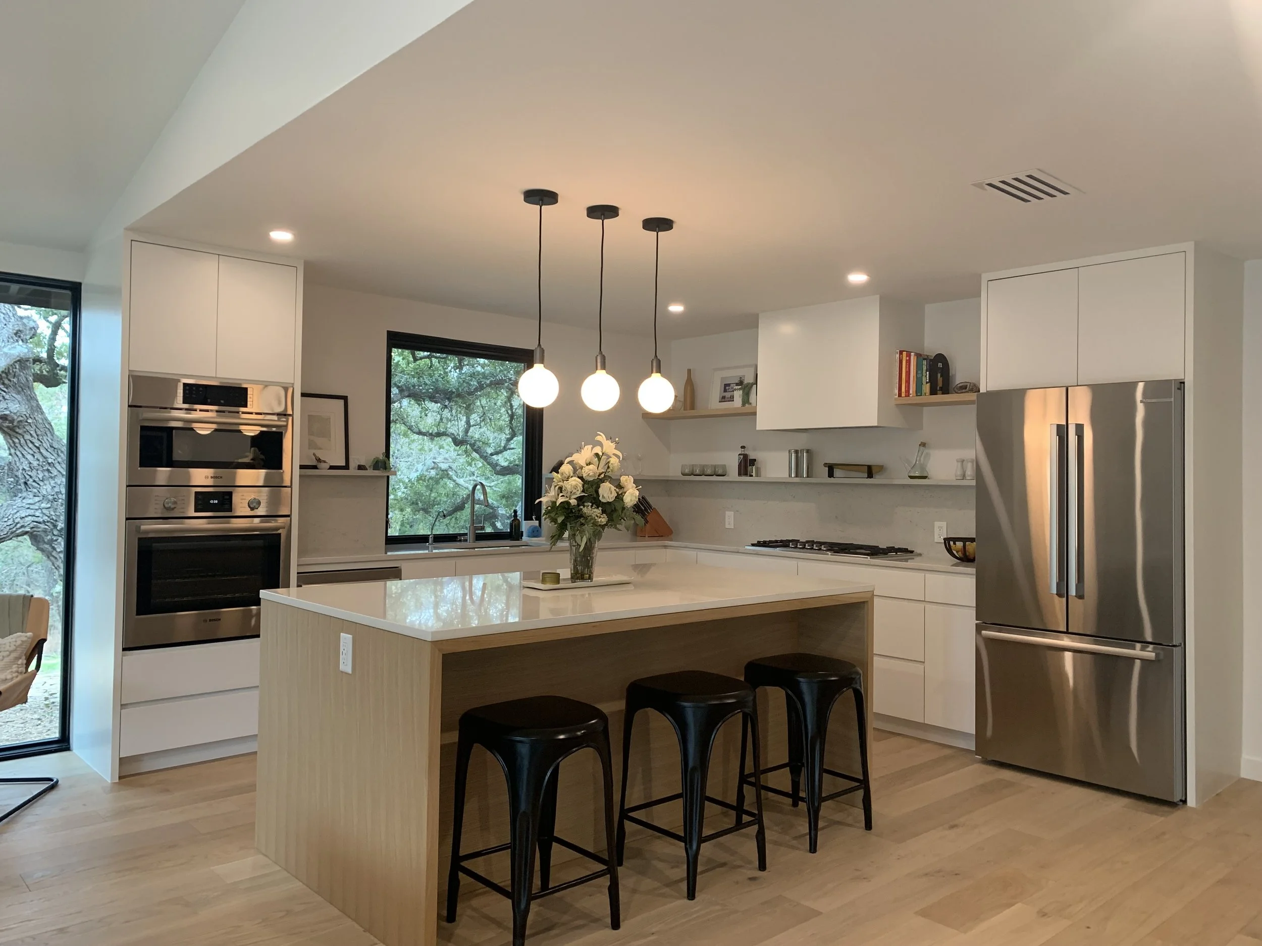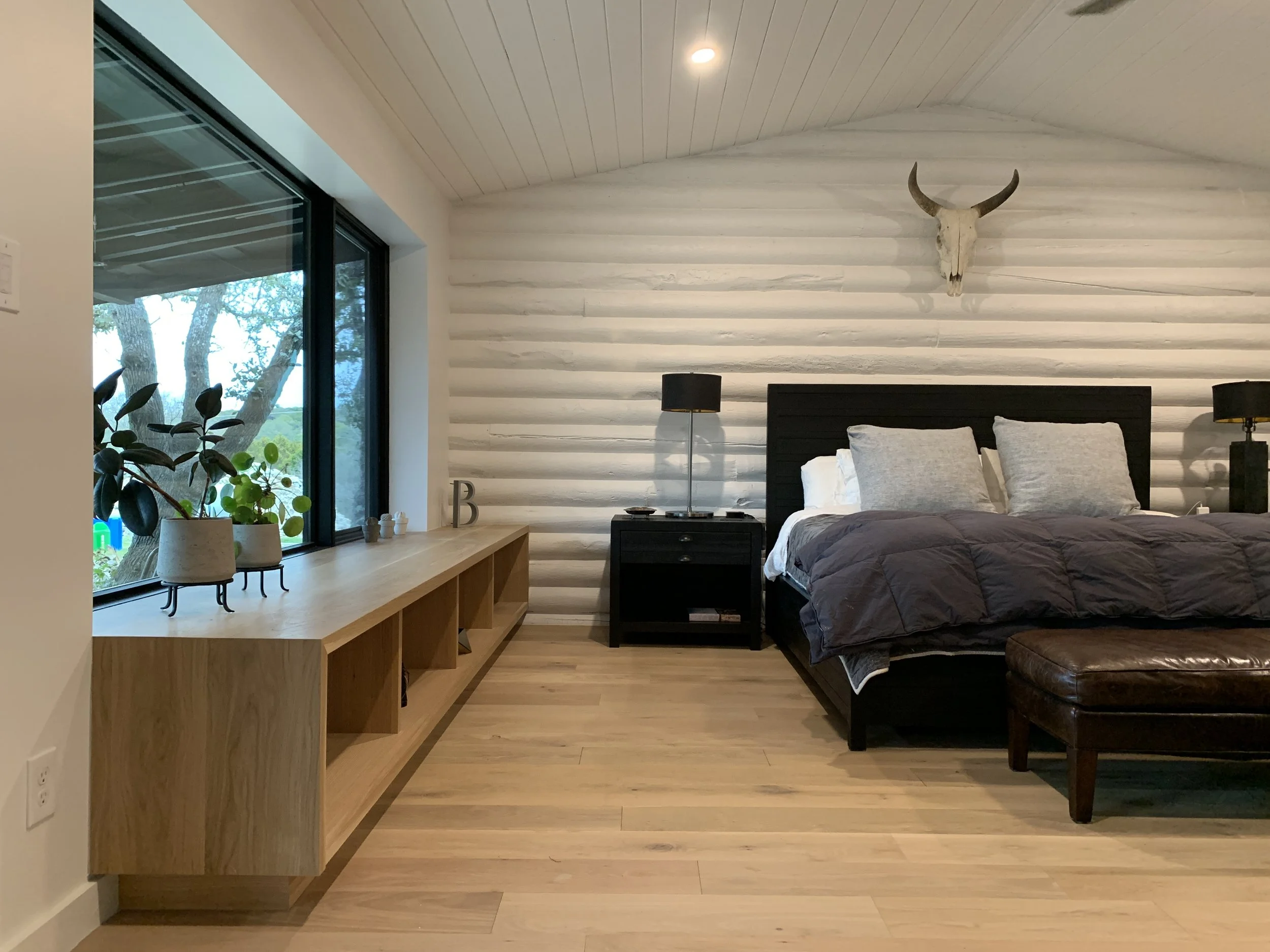 White oak and paint grade shelving and cabinets with custom milled, integrated door pulls.