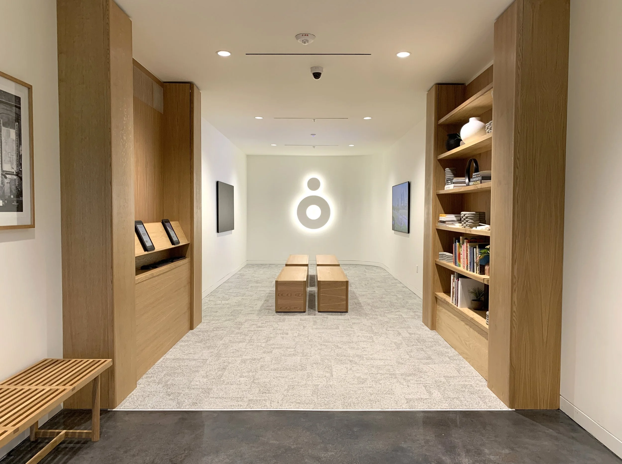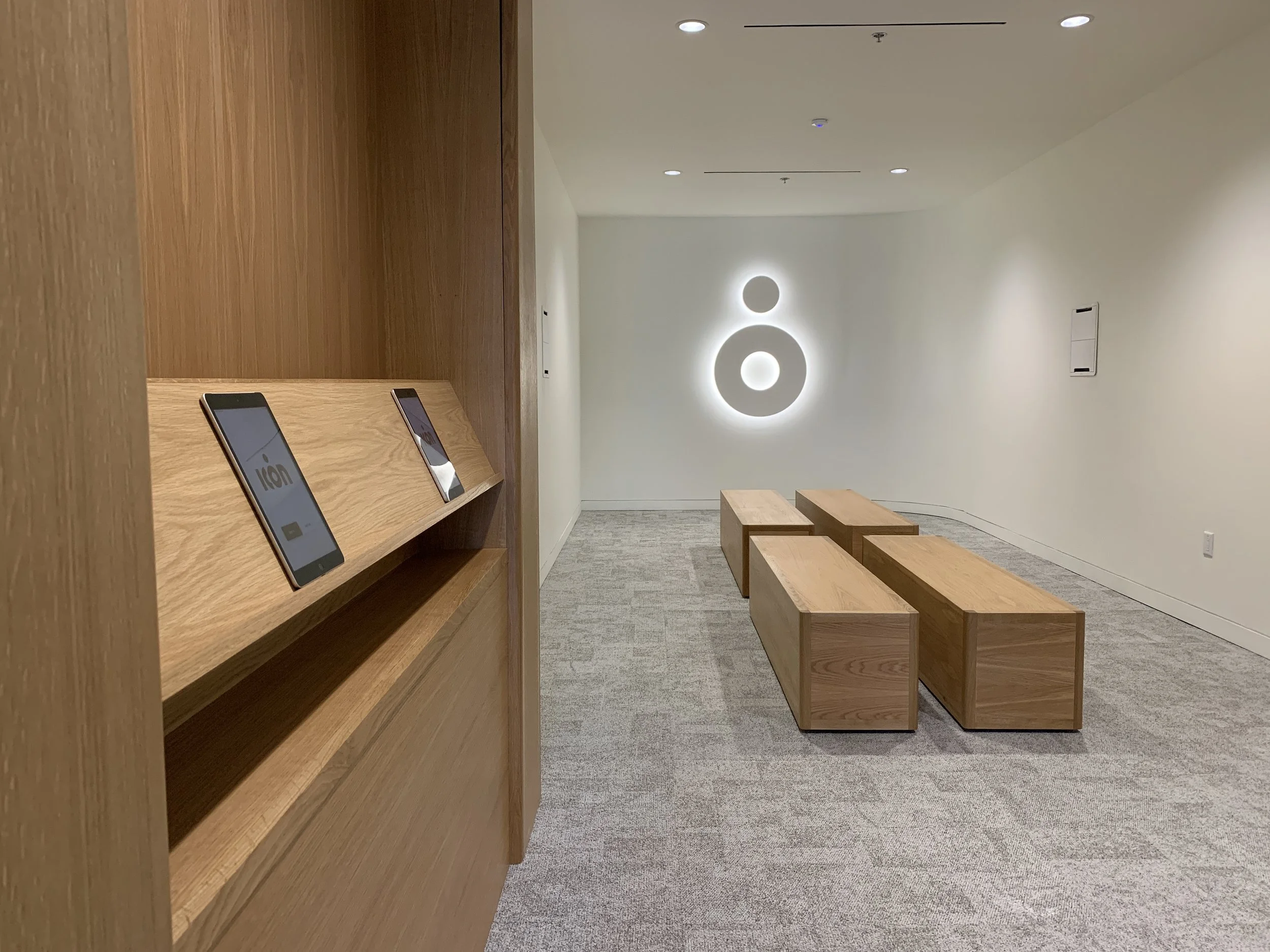 White oak furnishings including benches, shelving, and picture frame. Backlit logo made of aluminum.