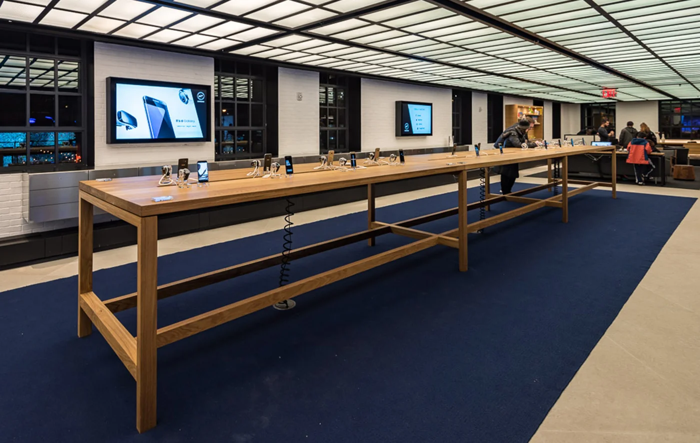 Made in collaboration with OHIO Design for Samsung 837. These tables were designed with OHIO’s minimal aesthetic and use bold dimensions to give visitors a rich experience. Slotted table tops and metal cable trays bellow accommodate Samsung’s products in elegant fashion. They shipped flat from San Francisco for permanent assembly in New York.
